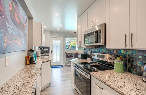 2 Bathrooms, TV's in each bedroom, full living area with 65" flat screen smart TV, cable, Wi-Fi, air conditioning, all utilities. Whole house water filtration system, osmosis drinking water. Fully equipped kitchen with stainless steel appliances, glass top stove, stackable washer/dryer. Microwave, toaster, coffee maker (Mr. Coffee and Keurig); literally your home away from home!