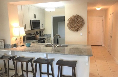 This 3/3 located in Waterside Village has all the extras to make your vacation comfortable and stress-free. We love to cook so we made sure to upgrade the kitchen with all the little extras to make your vacation stress-free. Quality dishes, high end pots and pans and other extras like a 2 coffee makers (Keurig and standard), a waffle maker, crock pot, and good knives! Downstairs, there are three grills by the pool area so Dad can cook while the kids play in the pool!