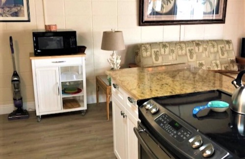 Kitchen is fully equipped and completely updated with new cabinets, granite countertops, convection/regular 6 burner oven, stainless steel appliances, spices or you can enjoy cooking your catch on the gas grill, or there are many great restaurants in the immediate area.