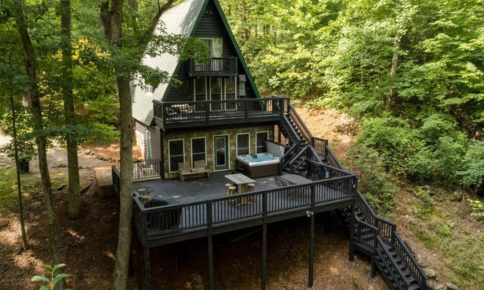 Falling Waters at Mustang Creek - A-Frame Lodge w/Hot Tub & Your Own Waterfall offers an idyllic setting for wedding stays, nestled within the serene National Forest of North Georgia. This enchanting lodge is not only a stunning backdrop for your special day but also provides exceptional amenities to accommodate you and your guests.