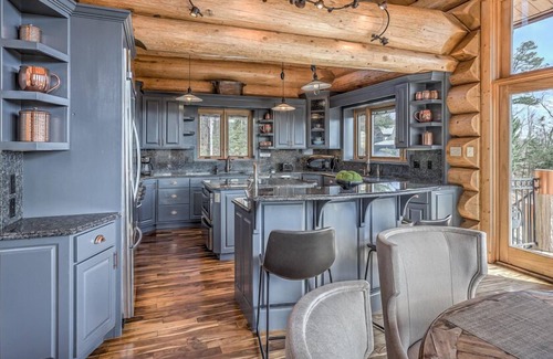 If you seek luxury, comfort, and style, look no further than Falling Waters Lodge. Beautifully decorated with hand-carved wildlife and Canadian logs, the rustic ambiance will make you feel right at home. Every single detail of this beautiful cabin is a living testament that craftsmanship is alive and well. You will enjoy the custom details, professionally decorated rooms, and all the amenities.