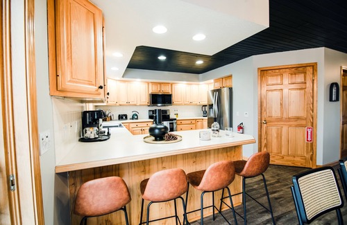 The amenities at FallWater are designed to ensure that your stay is both comfortable and memorable. Immerse yourself in relaxation with a private hot tub overlooking the lake or gather around the scenic firepit nestled in the woods. The spacious layout of 3,528 sq ft includes five elegantly appointed bedrooms and four bathrooms, featuring mid-century modern furnishings and a great room with breathtaking views through cathedral ceilings. Enjoy alfresco dining on the patio equipped for 12 guests, or create lasting memories in the entertainment hub of the walkout basement, complete with games and a large TV.