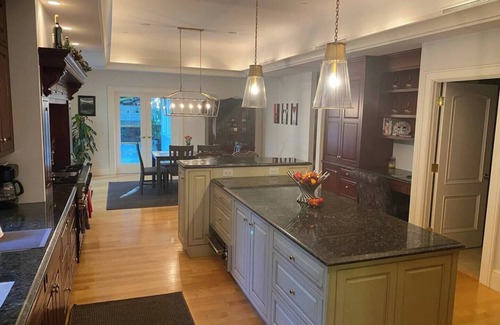 Our 8bd gigantic home is 11,200 square feet. It boasts cathedral ceilings, a giant kitchen (perfect for prepping large meals), a dinner table which sits up to 16 people, a pool table, ping pong table, shuffleboard table, and movie theater. It is the perfect getaway vacation home.