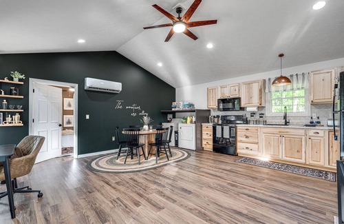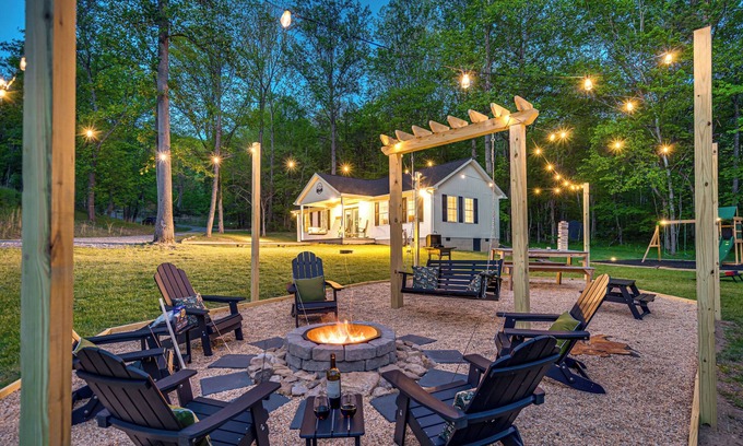 Modern and newly renovated cabin outfitted for families and pets featuring a playground, fire-pit, and BBQ under outdoor market lights. Tucked in a cul-de-sac situated on 1 acre of flat land; walkable to South Fork River for fishing/kayaking. Near Skyline Drive, Shenandoah National Park, Luray Caverns & Massanutten Resort. Sleeps 6 adults comfortably or up to 8 with children.