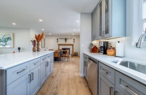 The Ranchette, situated on just under an acre of land, boasts a fully-remodeled interior that feels fresh and bright. Step inside to discover an open concept living area centered around a large kitchen island, fully equipped with everything you need to prepare delicious meals.
