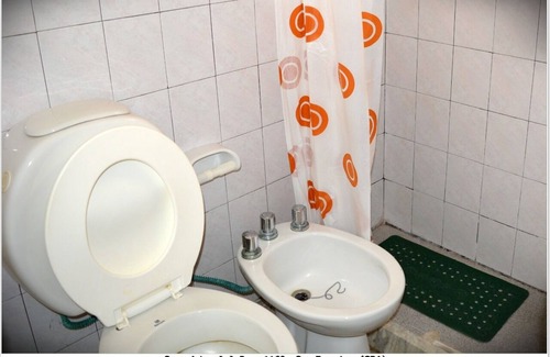 Bathroom with toilet, bidet and shower.