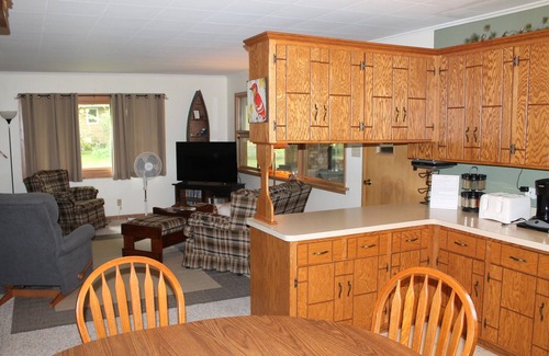Our cabin is all one level (1564 Sq Ft) with an open floor plan that has all the comforts of home. Sleeps a maximum of six guests (includes children) in two private bedrooms. A full bathroom with walk-in shower as well as a 1/2 bath. Couches are NOT pull-out sleepers. Amenities include bedding and bath towels, washer & dryer, dishwasher and a large eat in kitchen fully stocked with everything you need to enjoy family dinners; Spacious living room and sun-room porch. The garage has been converted into an All Purpose room that has a ping pong table to enjoy on rainy days. Space can also be used to store your fishing and/or boating accessories. Also, off of the all-purpose room is access to a crawl space in case of severe weather. This cabin is not air conditioned but has ceiling fans in most rooms and three portable fans are available. 50" Smart TV provides streaming only - No local channels. Sorry – No Pets or smoking allowed (inside or outside on property)!