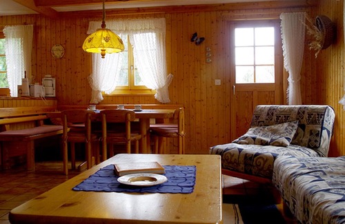 The two-story chalet for up to six people is very comfortably furnished. The furnishings consist of light solid wood furniture, the spacious living / dining room is equipped with a romantic wood stove, which provides cozy warmth in every season and creates a homely atmosphere.