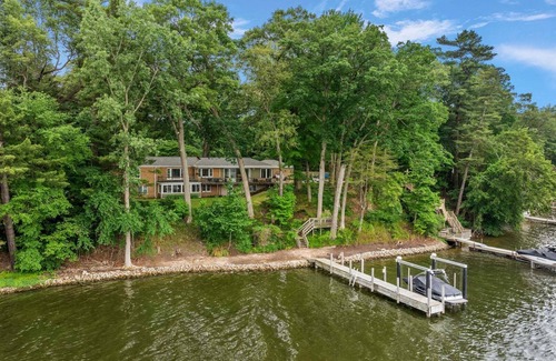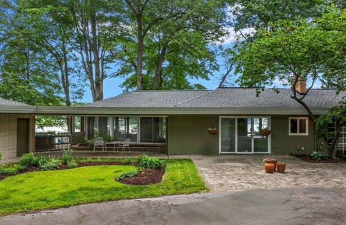 The house itself is an exposed ranch, with easy access for individuals with mobility issues (only 2 steps within the whole first level). With six bedrooms (4 king beds, 2 queen beds) there is room for families or multiple couples that want a retreat. The gourmet kitchen is set up with a eat-in breakfast bar, new stainless appliances, plenty of space to cook, and professional grade ice maker and beverage cooler. Adjacent to the kitchen is the great room, with windows on 3 sides and plenty of couches for everyone to have space and not be crowded. It's filled with lots of vintage mid-century details and vibes, perfect for those that want a lake house experience but not the cottage feel.