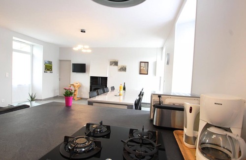 House adjoining another rental. On the ground floor: Living room. Kitchenette. Shower room. Toilet. Upstairs (via stairs and several steps): Bedroom 1 (2 single beds, 90x190 cm). Bedroom 2 (1 double bed, 140x190 cm). Bedroom 3 (3 single beds, 90x190 cm). Bedroom 4 (1 double bed, 140x190 cm). 1 child's bed. 1 sofa bed. Shower room. Toilet. Heating included. Wood stove. TV. WiFi (low speed). Washing machine. Dishwasher. Duvet covers and linens not provided. Cleaning service at an additional cost. Shared enclosed grounds. Picnic table. Barbecue. Sandpit. In the heart of a small, picturesque Cotentin village, this family-friendly cottage, converted from a former school, is close to the beaches.