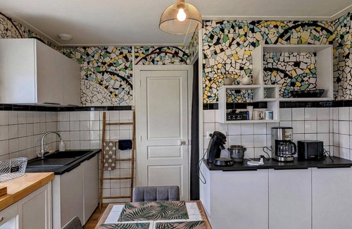 The Telegraph Gite was converted into the owner's family home, an artist's house (paintings, mosaics, etc.). On the ground floor: a fully equipped kitchen, a bathroom with a walk-in shower and toilet, a second separate toilet, a bedroom with two twin beds (90 cm), a living room with a wood-burning stove, TV, and Wi-Fi, opening onto a bright dining room.