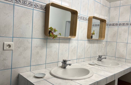 - A large batchroom with double washbasin, separate shower and separate WC.