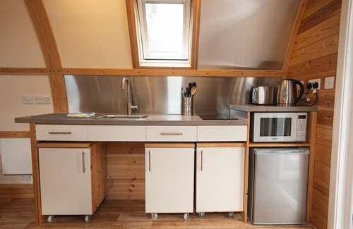 An accessible kitchenette with low worktop and sink, with accessible pull out cupboards with easy reach surfaces. With two plate electric hob, fridge, microwave, kettle and toaster.