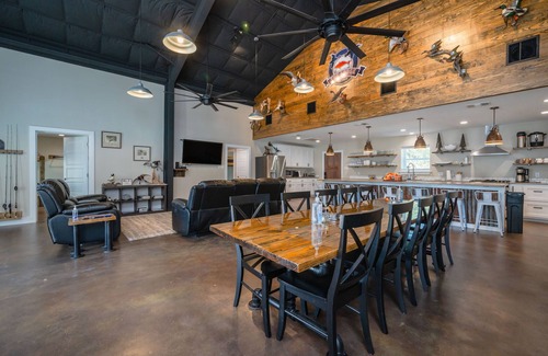 Enjoy the full-service kitchen overlooking the main room and use the large island for serving buffet & dinners. Bedrooms are located around the Great Room area. Each bedroom has 2 sets of Queen bunk beds, plus a dedicated bathroom for reach room. An additional twin bed set is available in one of the rooms. An Outdoor entertainment area featuring a Pavilion and firepit is the perfect place sit and unwind. After a day of hunting or fishing, you will find a fish/duck cleaning area as well as a Dog Kennel.