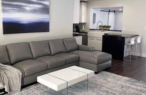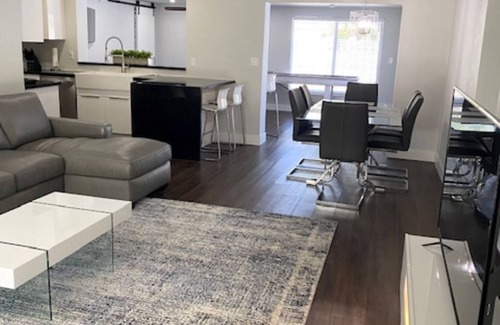 Living Room: 65" Smart TV and a large sectional with a Queen-sized pull-out bed, offering plenty of space for everyone to relax.