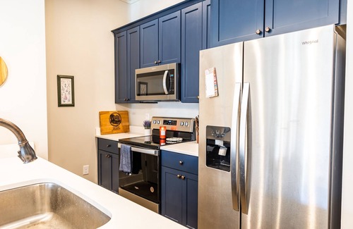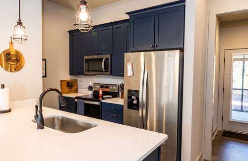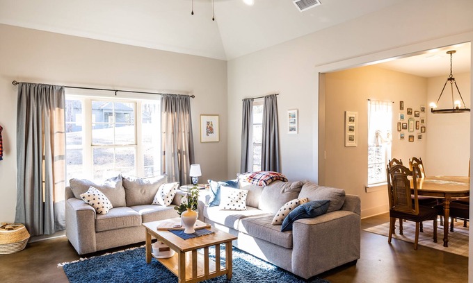 Enjoy Family Friendly Americana Living at Cabin America on Lake Martin! Brand new 3 Bed/2 Bath House that comfortably sleeps 6 with a king, queen, and two twin beds. All bedrooms have comfortable memory foam mattresses, smart TVs, and storage! There is a separate dining room for eating, as well as comfortable backed stools at the kitchen bar. The kitchen is fully stocked with all of the items that you'll need for cooking and entertaining. The large open-concept living room features a couch, loveseat, and armchair with a large-screen smart TV. There is a separate coffee bar, ice maker, and full-size washer and dryer. Both bathrooms have a shower-tub combo, along with shampoo, conditioner, soap, and hair dryer, along with other bathroom amenities. In addition to the inside, the large outdoor porch is screened in with a large sectional, fireplace, gas grill, and large-screen tv. And if you need some peace and quiet from all the fun going on out back, you can always relax on the front porch which has 2 chairs and an end table. The neighborhood also features a communal pool, boat launch, boat docks (first come, first served), trailer storage, and a fitness center.
