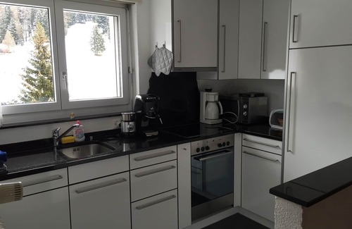 The comfortably furnished 3.5-room apartment is on the top floor (3rd) of the Chesa Grischa house. The house has an elevator and is in an unobstructed location directly on the Bünda (ski and sled paradise for children), which can be seen from the south-west balcony (sun all day). The kilometer-long cross-country ski trail is also right outside the front door. The ideal location means that all skiing and hiking areas as well as other leisure facilities can be reached on foot or by bus (5 minutes on foot). The apartment consists of 2 bedrooms, bathroom (with bathtub), extra toilet, large living room with open fireplace, stereo, cable TV, free WiFi and telephone. The kitchen is equipped with an oven, electric cooker, filter coffee machine and Nesspresso machine with milk frother, kettle, fridge with freezer and dishwasher. On request, we can also provide a cot and a high chair (toilet pad, changing mat and children's dishes are also available). From the balcony you have a wonderful view of the Bünda and the Jakobshorn. From the children's room as well as from the large bedroom you can see the Parsenn and the Seehorn. From the kitchen you can enjoy a wonderful view of the Pischa.