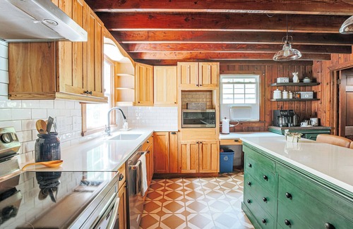 A covered front porch welcomes you to take your boots off a rock for a while. The stylish but cozy main living space has an open plan for connection in the living room and dining room. An open doorway separates you from the spacious kitchen with a custom island, coffee and tea station, and all the amenities you need for cooking. Stash all your supplies for your stay in the walk-in pantry alongside our gear and paper goods, which you are welcome to use during your stay. Head through the mud room and laundry to the covered side porch, where you'll find a great outdoor dining space (Steph's fave spot for a morning cup of tea). Other main-floor amenities include a full bathroom and first-floor primary bedroom with an attached office and private en suite bath.