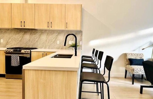 The living area is tastefully decorated and features comfortable seating, making it the perfect place to relax after a day exploring the city. The kitchen is fully equipped with modern appliances and all the necessary utensils to cook delicious meals. The dining area has a beautiful kitchen island with 4 bar stools and 2 chairs.