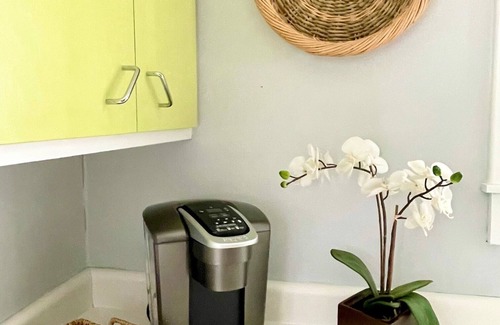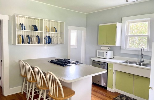The kitchen has a gas stove and range, dishwasher, refrigerator, microwave and Keurig coffee maker. It is fully stocked with all of the essentials, i.e. dishes, silverware, pots, pans, baking sheets.