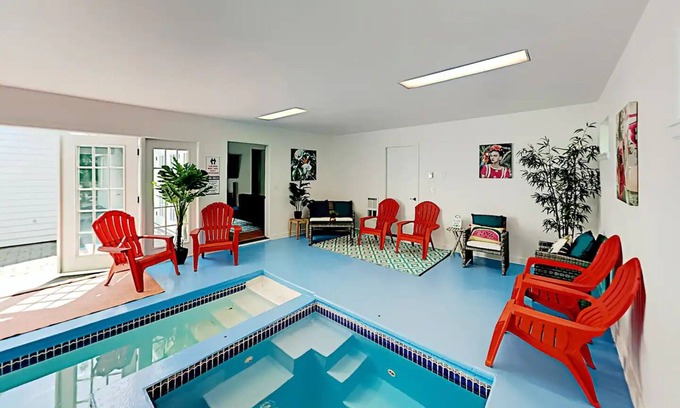 This rental has a unique indoor pool room with a heated dipping pool, hot tub, and seating.