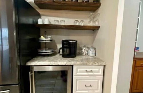 The large chef's kitchen is sure to impress as we turned this old living space into a dream lakefront kitchen with a commercial 48" 9 burner stove top with a double oven. You will find more than enough seating around the custom-made maple 4'x9' island along with the separate dining table. This space also has a mini fridge for wine and a separate mini fridge for cans. There is a dishwasher and basic cooking amenities. We also added a very large pantry which is located right next to the stocked coffee bar. The kitchen also has a mounted tv.
