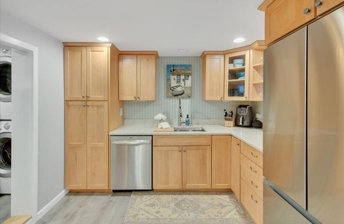 The back bedroom on the lower level features two twin beds that can be combined into a king if needed, making this room ideal for friends or family. This floor also has a separate laundry room, a second remodeled bathroom with a relaxing spa tub, and easy access to the outdoor living spaces.