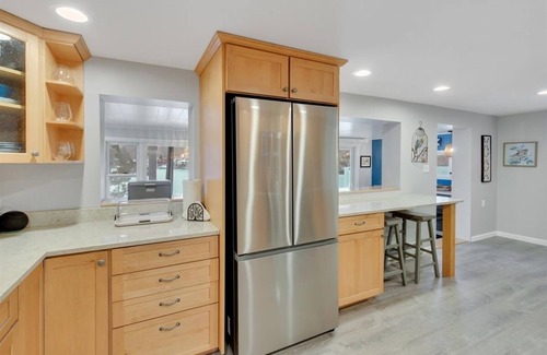 The lower level of the cottage is all about convenience and ease, with a fully updated kitchen featuring beautiful maple cabinets and brand-new stainless steel appliances. Whether you’re preparing a simple meal or a special family dinner, you’ll appreciate the kitchen’s thoughtful design. There’s plenty of space to enjoy your meals, with a breakfast counter in the kitchen and a dining area that overlooks the lake.