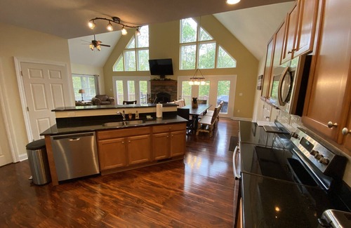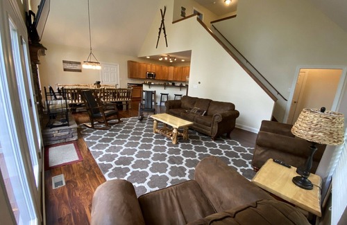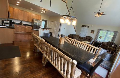 The house comfortably sleeps 13 with a king size bed and sleeper sofa in the master bedroom, a queen size bed and a full size trundle in the second bedroom, another queen size bed in the third bedroom, two sets of twin bunk beds in the large open basement, and a sleeper sofa in the living room. The three and a half bathrooms will accommodate a large number of guests. The kitchen is fully stocked with all of the dishes and cookingware you need as well as a Keurig so you can feel energized for your day of adventure. The open concept living room and dining room area is perfect for large groups. Watch the sun set through the windows while staying cozy and warm next to the fire in our wood burning fireplace. The dining room table seats at least ten with an additional three seats at the counter, so your group can share meals together. The theater has seating for five, a massive 70 inch TV, and a mini fridge so you won’t have to miss a second of your favorite movie when you need a drink. The arcade is equipped with your retro favorites, including Ms. Pacman, Golden Tee, 4 player NBA Jam, and electronic darts. We offer the fastest WiFi available in our area so you enjoy using all of your personal devices as well. The fire pit, which has seating for 13, has been one of our guests’ favorite parts of the property. We believe vacation should be more fun and less work so we offer firewood for purchase (optional) on site so you don’t have to worry about bringing your own. Each section of firewood in our rack includes a tub of kindling so you have everything you need to enjoy your time by the fire and payment can be made at the end of your stay. Need to charge your EV during your stay? No problem! There is a 50 amp exterior outlet that guests can use for no additional charge. Please remember to bring your own EV charging cord. If you have any additional questions about the property, we would be happy to help! Please message us anytime!
