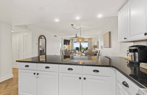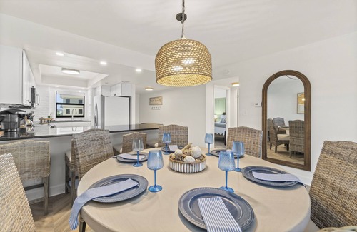 With elegant new finishes and thoughtful upgrades throughout, this beachfront retreat strikes the perfect balance of sophistication and comfort. A comfortable living area with plenty of seating for the entire group anchors the large living space and leads out to the balcony. The open kitchen keeps the chef involved with the fun. Bar stool seating for 4 connects the kitchen to the dining room that comfortably seats an additional 6 people.