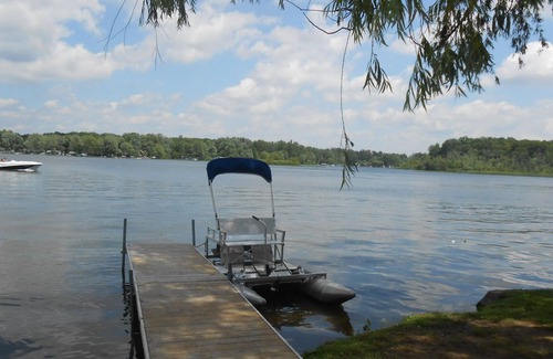 Lake front,fully furnished 2 bedroom, 1 bathroom, cabin sits on spacious property. Set up to sleep eight. All needs have been met. Amenities include, bedding, linens, towels, completely furnished kitchen, one full-size bed, one single-bed with trendle, two futon couches, 2 flat screen tv's, dvd player, floors fans, window air conditioner. Kitchen has toaster, microwave, coffee maker, blender, hand mixer, glass and plastic dishes, pot and pans, glassware, utensils, bakeware, etc. Livingroom has a fireplace with a gas insert. Cabin has a wood deck facing the lake with picnic table and gas grill. There is a shed on the property that houses a stackable washer and dryer. It also has the paddles, lifejackets, a chest freezer, etc. to use during your stay. There is a sandy beach area and the swim area is great for enjoying the water. While renting the cabin, you also have use of the paddleboat, two kayaks, and a rowboat. The property also has a firepit and lawn chairs. Property also has its own dock . Located near public access for convenient launching of water vessels. Local party and bait shop is only 100 yards from cabin and can meet all of your needs such as bait for fishing, gas for boating and groceries( including liquor, beer, and wine. Hand-dipped ice cream in summer months. This property is rented out by the week during the summer season ( Memorial Weekend thru the month of September). The weekly rental runs from Saturday to Saturday. During the month of October this property can be rented out for long weekends to enjoy a fall getaway. The incredible fall foliage never disappoints!