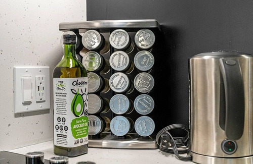 As soon as you step inside, you’ll spot a coat closet on your left, complete with a washer and dryer for your use—detergent’s all set, too! If you run low, there are extras under the kitchen sink. Got a furry friend tagging along? You’ll find an acrylic set of dog bowls for food and water, plus some pet toys to keep them entertained. Just a heads-up—please don’t take those toys home!