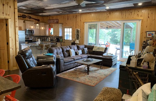 Our home will sleep 10 comfortably. There is a master suite with king bed and full bath. Second bedroom has queen. Bunk room has two full beds and two twins. Second bedroom and Bunk room share full bath. Kids can enjoy the ping pong table, shuffle board or play horse shoes, while adults enjoy the beautiful lake view from the deck. Kitchen has everything you need if you like to cook. Brand new stainless appliances, granite counter tops. If you prefer the outdoors, you can grill on the gas grill on the deck. During football season you can watch games on the sixty inch TV. There is a washer and dryer if you need to get caught up on laundry.