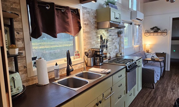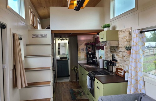 Were located on a busy farm with agriculture farming, as well as manufacturing tiny homes. Two car parking is easy close but lots of parking if you bring more than one vehicle. Highway can be noisy during day but inside I don't hear anything! Wifi can be spotty due to being out in the country.