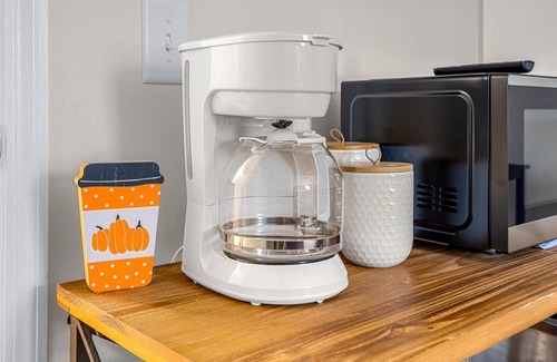 The living room/ kitchenette area includes a futon that transforms into a twin bed, a mini fridge/freezer, microwave, Air fryer, Griddle, blender, toaster, and coffee maker. Also provides a dining area to enjoy meals.