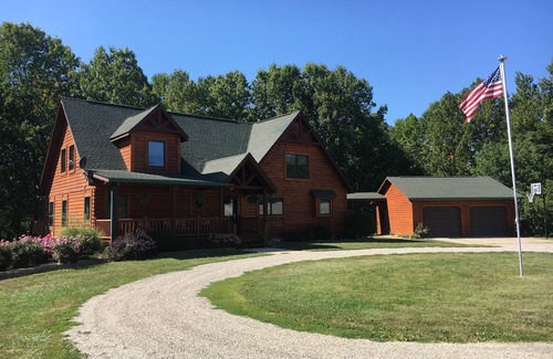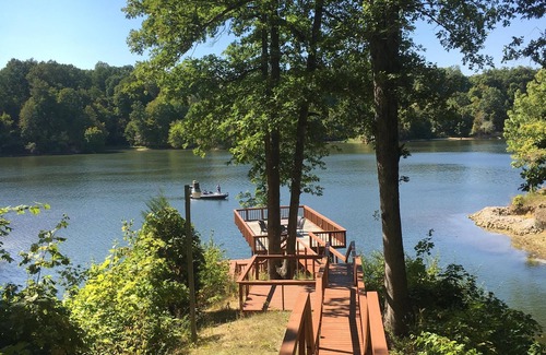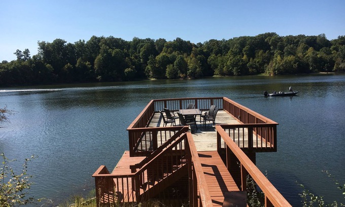 Complete with boat dock, fire pit, charcoal, grill, large hot tub, and beautiful views overlooking Mill Creek Lake in Marshall, Illinois. Perfect for family reunions or couples get away. Master bedroom with two queen beds and master bath. Two bedrooms upstairs with queen beds and full bath. Bunk room in basement with 4 queen over queen bunk beds. Full bath downstairs.