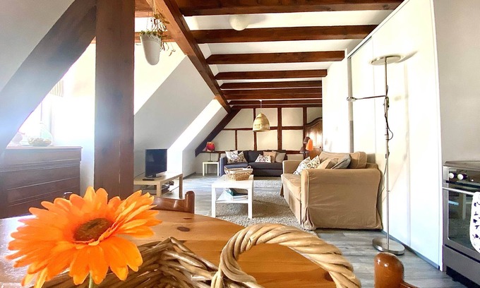 The Charlotte cottage is a 110m² cottage for 6 people located on the first floor, in the attic of the ZEYSSOLFF wine cellar. It has individual electric heating and air conditioning. Its exposed beams combined with white and taupe tones make this apartment an authentic and modern cottage. It has a small entrance with a closet. A living room with a flat-screen TV and DVD player, sofas and armchairs invite you to relax. A fully equipped kitchen area is at your disposal (dishwasher, washing machine and dryer, microwave, fridge-freezer, vitro hob and oven). 2 independent bedrooms each have 2 beds, plus 1 independent bedroom with a double bed and bathroom (shower). Second bathroom with shower and toilet. Separate toilet. A 9m² dressing room.