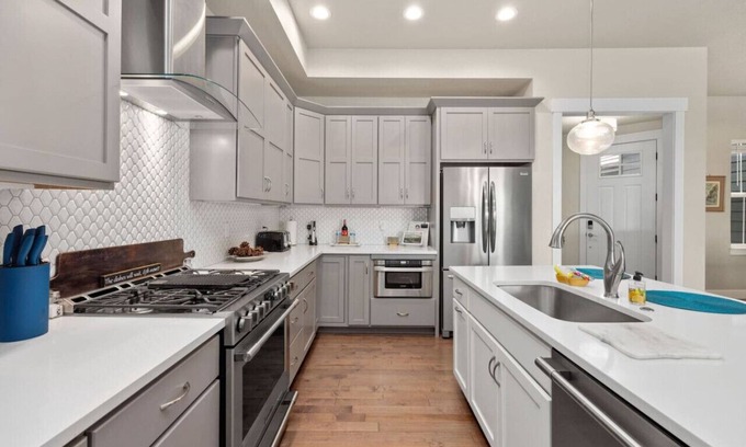 Cook a nice meal in the fully equipped kitchen featuring quartz countertops, refrigerator, microwave, 4-burner gas range, small oven, toaster, coffee maker, blender, hand mixer, cooking utensils and dishes. We'll provide coffee, creamer, and sugar as well as cooking spray, spices, salt and pepper.