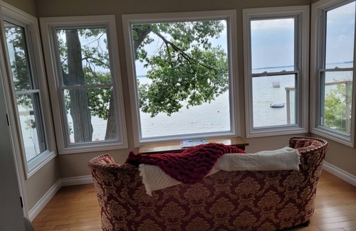 The staircase leads to the Common Room. This room which provides additional space for lounging, faces the water and is furnished with comfortable seating, a high quality leather queen sized sofa bed, and a high efficiency air tight wood stove (firewood supplied) at the other. Enjoy the charm and warmth of a wood burning stove.