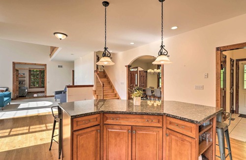 Steal a sweet summertime escape with extended family and friends to this spacious vacation rental! With 6 bedrooms, 5 baths, a gourmet kitchen, and 5,500 square feet of living space, this house is well-equipped for your next relaxing retreat. The yard features a private pool, lounging deck, and fire pit, all surrounded by preserved land. Venture on one of the hiking trails through 120+ acres of preserved wildlife sanctuary, or enjoy canoe and beach access at Candlewood Lake 1 mile away.