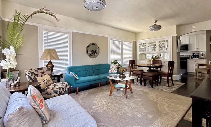 Enjoy this beautifully renovated home with secure, no-contact self-check-in and a security system. The home offers fast WiFi at 538 Mbps, workspaces for laptops, and is equipped with a plush king bed, 4 smart TVs, free parking, and complimentary organic coffee and tea. The bungalow is fully furnished, including a well-equipped kitchen with a microwave and dishwasher, as well as a washer/dryer, iron, ironing board, and steamer. The living spaces and bedrooms have ceiling fans and the bathroom features a large soaking tub and shower.