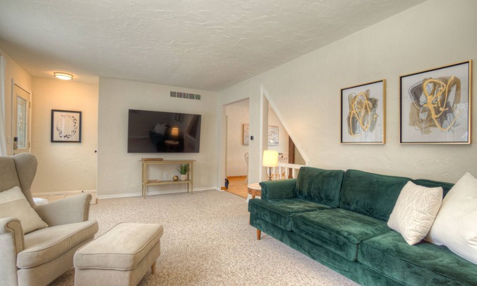 This recently updated 4-bedroom, 1.5-bathroom home easily accommodates up to 8 guests. The fully-equipped kitchen boasts elegant quartz countertops and essential appliances, making meal preparation a breeze. Unwind in the expansive living room featuring a 70-inch 4K UHD smart TV, or retreat to the basement game room for a lively session of foosball, complemented by a wet bar and an impressive 75-inch flat-screen TV. Outside, the backyard invites relaxation with a gas grill, fire pit for s'mores, and comfortable lounge chairs — all perfect for post-wedding celebrations.