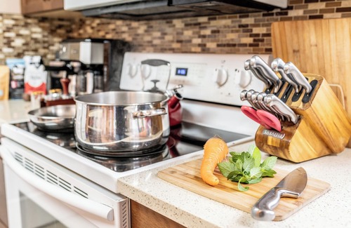 The fully stocked kitchen is a chef's dream, featuring a spacious island, instant pot, Vitamix blender, popcorn popper, and more. Whether you're whipping up a quick breakfast or preparing a gourmet dinner, you'll find everything you need right at your fingertips.