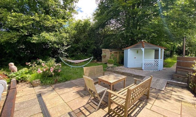 Family home with large garden, swimming pool, wood fired hot tub, sauna and yoga studio in quiet village near Totnes. 4 bedrooms including a separate annex with en-suite and kitchenette.