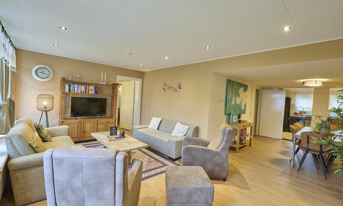 Family home with on the ground floor 2 bedrooms, one with en suite, and a separate bathroom. Cosy living room, dining room and open kitchen. On the 1st floor (accessible via a steep staircase) are 2 more bedrooms and a bathroom with bathtub. The house has a private garden with covered terrace, a hot tub and plenty of parking space. All bedrooms are equipped with a separate sink and a smart TV. Perfect for a relaxing stay with the whole family!