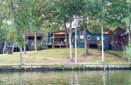 5 Bed rooms - 3.5 bathrooms, 2 bunk houses, sleeps 15 easy - 20 people if you have children and they don't mind the sofa. Commerical kitchen, 8 kayaks, washer and dryer, 2 shady pavilions, secure swim area, fishing dock, poker table. Great place if you need room for large families, or just need a place to chill out with that special someone! House has direct tv for your choice of sports, and is now set up with Wi-fi.