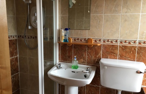 Utility room with washing machine and tumble dryer. Shower room next to it with shower, toilet, wash basin.