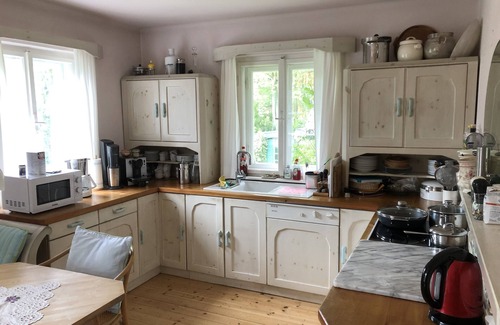 Beautiful single-family home in country house style from the 1950s with wonderful privacy is located in the middle of the idyllic town of Anif (approx. 6 km from the city of Salzburg). The house with spacious rooms and the charming garden scores with numerous extras that make your stay unforgettable: including a sauna (5 p.m. to 10 p.m. possible) in the basement for relaxation, a magical swimming pond that is open between May and September Bathing invites you, the delightful bathhouse and a lovely glazed veranda with a large dining table.