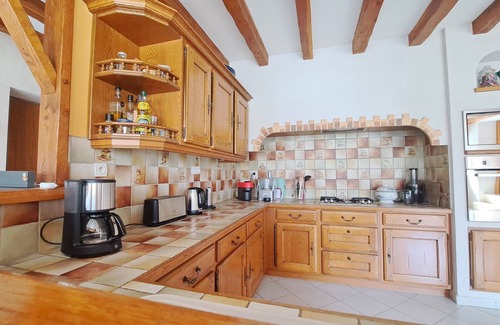 The kitchen is equipped with a raclette machine, fondue set, yogurt maker, ice cream maker, standard coffee maker, microwave, American-style refrigerator, electric oven, and gas hobs.
