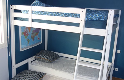 Ideal house for families with 3 bedrooms. The first with 1 double bed of 160 * 200 cm, the second with 1 double loft bed 140 * 190 cm and below 2 single beds 90 * 190, and the last composed of 2 convertible sofas 100 * 190.